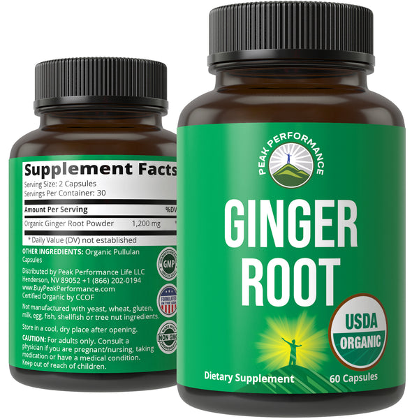 - Don’t be fooled. Ginger Root Extract capsules that aren't Organic can contain unwanted contaminants. Peak Performance ensures you have a USDA Organic, high quality supplement that is 3rd party tested for purity.